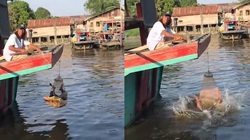 Bé trai nằm võng hoảng hồn khi chạm mặt với 'bé na'
