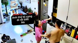 Bé trai ngã bật ngửa xuống nền nhà, ngó nghiêng xung quanh rồi bật khóc nức nở, hờn trách mẹ.