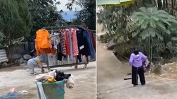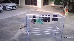 Bé trai phơi quần áo nhảy như tôm vì nền sân nóng