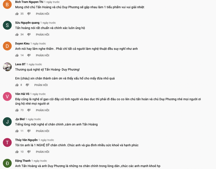 Sau đó, nghệ sĩ Tấn Hoàng cũng bày tỏ cảm nhận của mình về những chỉ trích mà anh nhận được từ đồng nghiệp trẻ. Tấn Hoàng cho biết, thời gian qua anh thường xuyên đăng tải nhiều video như là một cách để giãi bày tâm tư, suy nghĩ của mình. Anh nói: "Những clip tiếng lòng của tôi làm phật lòng một vài em nghệ sĩ, có một số ít, không nhiều gọi điện cho tôi nói nặng, những câu nói nặng tôi không thể nói được. Có thể các em ấy chưa hiểu, các em ấy nói tôi là già rồi, lớn tuổi, hết thời rồi nên câu view, câu like, được ông Dũng bà Hằng cho tiền. Cuộc đời tôi nghèo thì có nghèo nhưng khổ thì không khổ. Tôi còn làm ra tiền được, vẫn nuôi vợ nuôi con, nuôi cháu được, việc gì phải đi xin tiền người ta. Các em hãy bình tĩnh lại, đôi khi anh nói ra sự thật, các em gọi điện nói nặng nhẹ không sao, đã là anh em trong nhà nên sẽ tha thứ cho nhau".