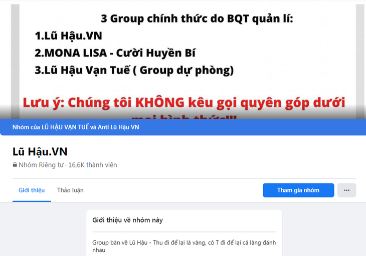 Trong số đó, có một group mang tên Lũ Hậu.VN đang có 16.000 thành viên và được để chế độ riêng tư cùng việc quản lý bài bản. Thông tin trên group này cũng cho thấy có thêm 2 nhóm khác được lập ra cùng mục đích tẩy chay Thủy Tiên mang tên Mona Lisa - Cười Huyền Bí và Lũ Hậu Vạn Tuế.