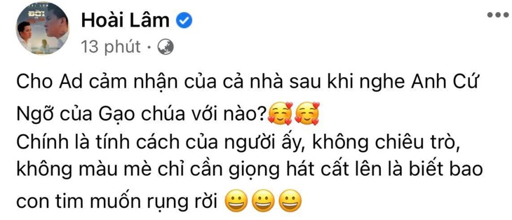 Sau thời gian im lặng, gánh chịu chỉ trích, ngày 12-5, phía Hoài Lâm lên tiếng đầy ẩn ý: "Chính tính cách của người ấy, không chiêu trò, không màu mè, chỉ cần giọng hát cất lên là biết bao con tim muốn rụng rời".