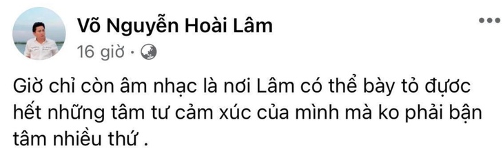 Trên trang Facebook cá nhân, Hoài Lâm cũng tiết lộ mối quan tâm lớn nhất ở thời điểm hiện tại: "Giờ chỉ còn âm nhạc là nơi Lâm có thể bày tỏ được hết những tâm tư, cảm xúc của mình mà không bận tâm nhiều thứ".