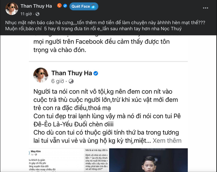 “Người ta con nít vô tội, không nên mang vào cuộc trả thù của người lớn. Con tôi đẹp trai lạnh lùng vậy mà nó đi nói con tui yếu đuối chèn ơi. Cho dù con tôi có thuộc giới tính thứ ba trong tương lai tôi vẫn vui vẻ và ủng hộ không kỳ thị, miệt thị hay xúc phạm, đó là văn hoá văn minh, tôn trọng”, Thân Thúy Hà đáp trả.