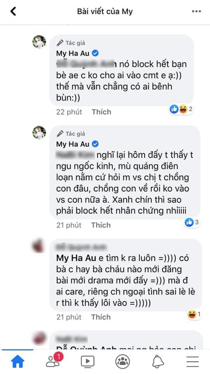 Không chỉ có vậy, trên một bài đăng ở Facebook cá nhân, có cô bạn thân của Âu Hà My than thở rằng mình đã bị Trọng Hưng block. Đây có lẽ là nhân vật xuất hiện cùng Hà My tại bệnh viện, khi cô bị sẩy thai. Người bạn này viết: “Cái sai của tao là lúc mặt mày tái nhợt, nằm lết ở viện, mặt tái không còn giọt máu đã không chụp ảnh mày lại, không selfie, để cho bàn dân thiên hạ biết cả mày và mẹ nằm mệt mỏi ở viện như thế nào. Không ai tự nhiên khỏe mạnh và giả vờ ngất để vào viện nằm truyền nước. Một nhân chứng sống có mặt ở viện vào đêm hôm đó đây. Hưng ơi, bỏ block em đi”.