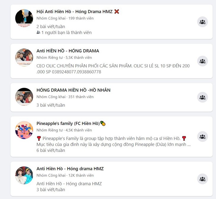 Bùng nổ chưa được 3 ngày, thì hàng loạt các group hóng drama Hiền Hồ cũng như nấm sau mưa mọc lên… đông nghẹt. Có những group lên đến mấy chục ngàn người. Nội dung cũng chỉ xoay quanh các nghi vấn giật chồng của Hiền Hồ, tìm thêm bằng chứng, suy luận, để rồi đả kích, chế giễu, chửi bới thậm tệ nữ ca sĩ.