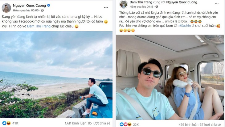 Vợ chồng Cường Đô La cũng là nhân vật ‘ngồi không dính đạn’. Đang hạnh phúc vi vu bên nhau, cả hai vợ chồng ‘tá hỏa’ khi mở mạng thấy tên mình bị réo gọi. Lập tức cả vợ cả chồng đồng loạt lên tiếng, trấn an dư luận. Cũng may là có các ‘camera chạy bằng cơm’ chụp được khoảnh khắc hiện tại của hai vợ chồng này, netizen mới đồng loạt tin tưởng tha cho ‘nghi phạm’.