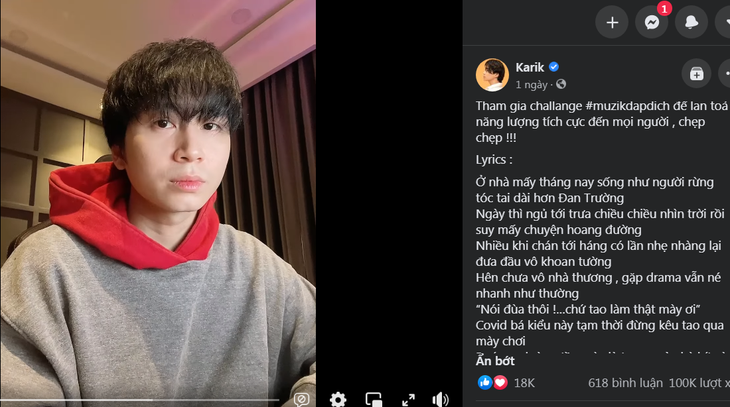 Cụ thể, chàng “thi sĩ của làng rap Việt” Binz đăng tải video hưởng ứng chiến dịch sáng tác này từ chiều 14-8 và nhận được nhiều phản ứng tích cực. Mặc dù đang ở nhà nhưng giọng ca Bigcityboi vẫn mang khẩu trang, tuân thủ nghiêm ngặt quy tắc 5K khiến nhiều người tỏ ra thích thú.