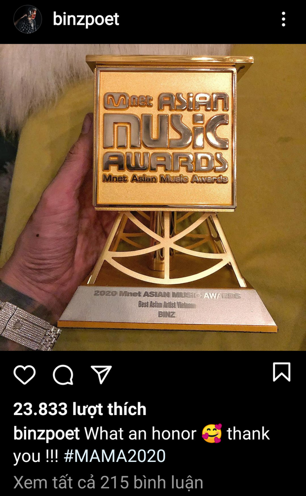 Binz khoe cúp đạt giải Best Asian Artist Vietnam tại MAMA 2020Sáng 24-11, trên Instagram, Binz khoe chiếc cúp Mnet Asian Music Awards - MAMA 2020 cùng giải thưởng ghi rõ tên anh - Best Asian Artist Vietnam - Nghệ sĩ Châu Á xuất sắc nhất - khu vực Việt Nam). Đi kèm hình ảnh, nam rapper đình đám không giấu niềm tự hào: "What an honor! Thank you".