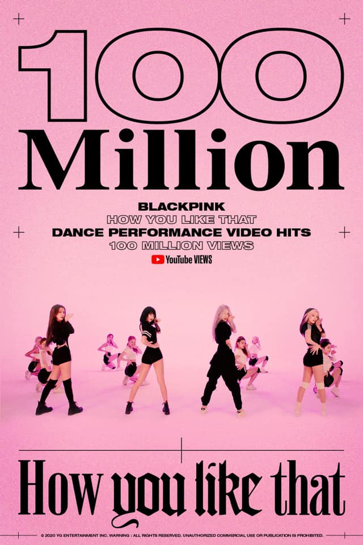 Video vũ đạo ca khúc How you like that của Blackpink đạt 100 triệu view.Đối với video vũ đạo của How you like that, Blackpink đã chiêu đãi Blink “bữa tiệc thị giác” với visual cực đỉnh, những vũ đạo uyển chuyển, nhịp nhàng nhưng không kém phần sắc bén và mạnh mẽ.