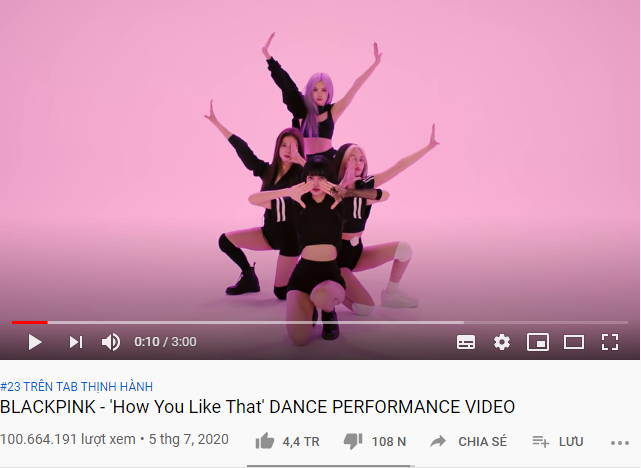 Sáng 22-7, bản Dance Performance (video vũ đạo) của ca khúc How you like that đã cán mốc 100 triệu lượt xem. Đây cũng là video tập nhảy thứ 9 của Blackpink đạt được thành tích này. Qua đó kéo theo vô số kỷ lục vô tiền khoáng hậu của 4 cô gái nhà YG.
