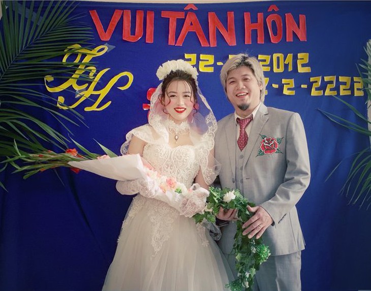 Cặp đôi "cưới lại" sau 10 năm kết hôn có sự chung vui của 4 con.Váy cưới được chị giữ lại từ hồi trước khi còn làm thợ trang điểm. Vest chú rể mượn được từ bố vợ. Bố mẹ chồng cho mượn chăn, còn phông xanh chị hỏi nhờ nhà hàng xóm. Tận dụng tất cả mọi thứ "cây nhà lá vườn", chi phí cho bộ ảnh chỉ gói gọn vào khoảng vài trăm nghìn đồng.