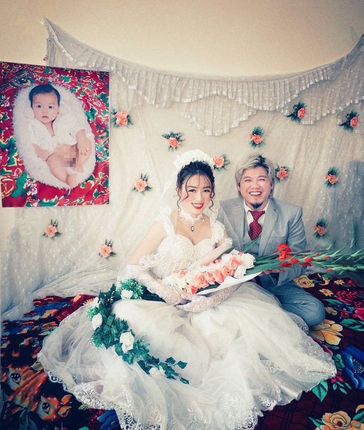 Chị Huyền cho hay, sau khi nhìn thấy những bức ảnh cưới của bố mẹ ngày trước, ý định có được một bộ ảnh cưới mang phong cách hoài cổ cứ thôi thúc trong lòng. Từ đạo cụ, trang phục cho đến hoa lay-ơn... đều được hai vợ chồng tự tay chuẩn bị.