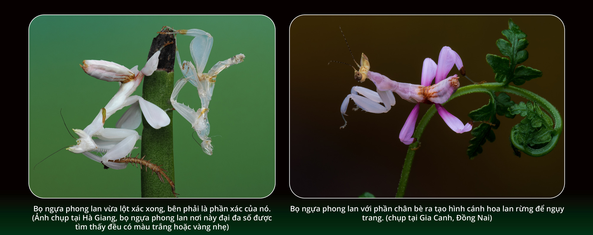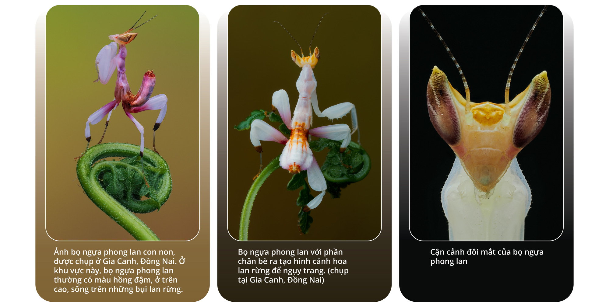Những con bọ ngựa phong lan mà tôi giới thiệu ở đây đã được chụp ở Gia Canh, Đồng Nai; Nam Cát Tiên, Hà Giang…