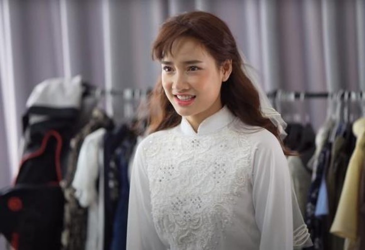 Mới đây, trong một đoạn clip hậu trường phim, Nhã Phương gây bất ngờ khi diện áo dài cưới. Trái với những bộ trang phục màu mè, diêm dúa vốn được xây dựng cho hình ảnh của nhân vật Báu, lần này, cô nàng được diện áo dài cưới màu trắng trông khá thanh lịch.