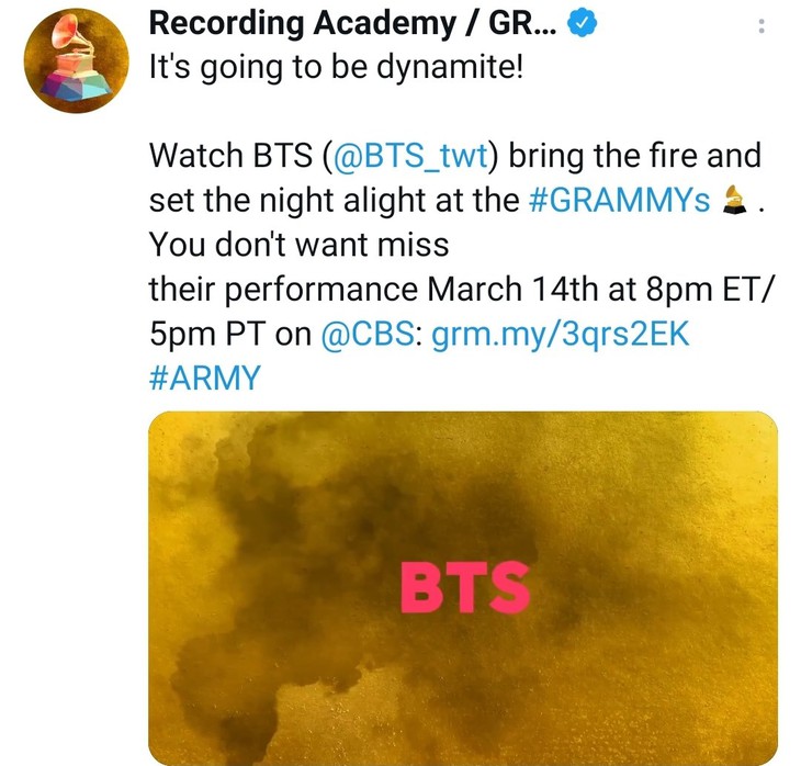 Cụ thể, vào khoảng 2h sáng ngày 8-3 (giờ Việt Nam), Ban tổ chức Grammy đã chính thức công bố dàn line-up nghệ sĩ trình diễn của mình. Và đúng như kỳ vọng của fan hâm mộ trong suốt những ngày qua BTS đã chính thức được gọi tên. Được biết, BTS sẽ trình diễn siêu hit Dynamite tại sân khấu vô cùng đặc biệt này.