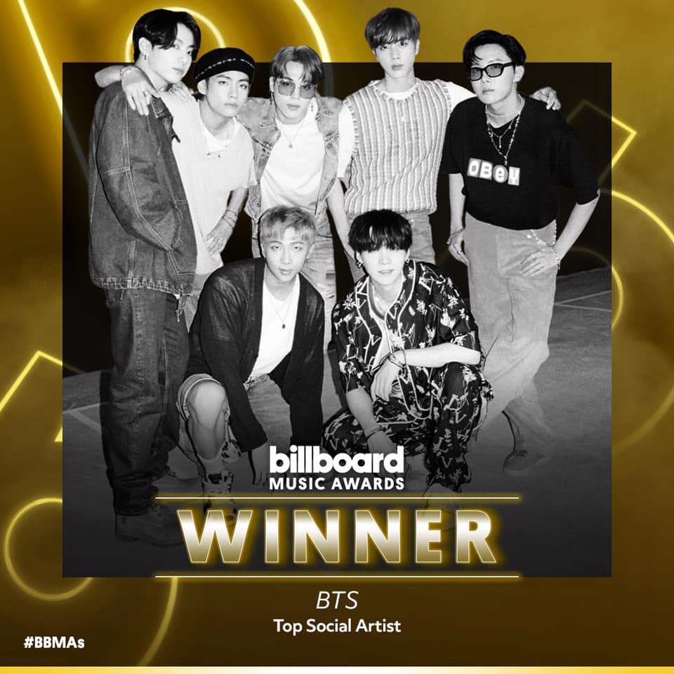 BTS lần thứ tư liên tiếp thắng giải tại hạng mục Top Social Artist của Billboard Music Awards 2020.Trong hạng mục này, BTS đã được đề cử cùng EXO, GOT7 và Ariana Grande, nhưng với sức hút của mình nhóm nhạc nam nhà Big Hit đã vượt qua những đối thủ đáng gờm và chiến thắng giải này một cách vô cùng dễ dàng.