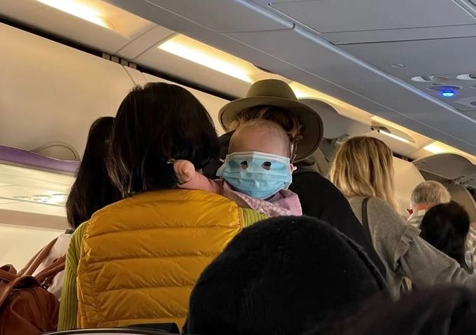 Bức ảnh em bé đeo chiếc khẩu trang màu xanh kích cỡ của người lớn, được chụp trên chuyến bay của hãng Air New Zealand, đã tạo nên một cuộc tranh luận trên cộng đồng mạng.