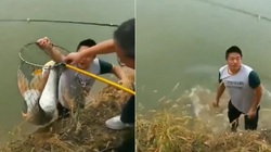 Cần thủ nhún nhảy sung sướng vì con cá không thoát khỏi tay mình