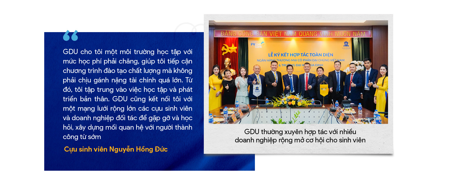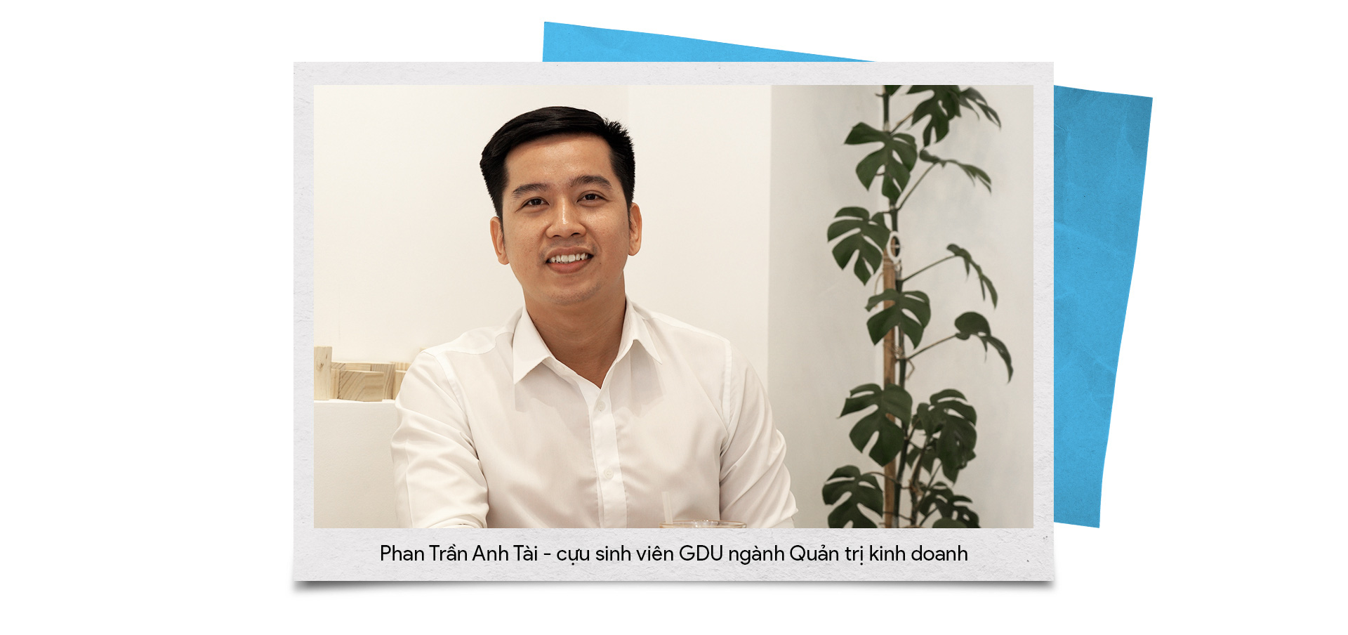 Phan Trần Anh Tài - cựu sinh viên ngành quản trị kinh doanh của GDU, hiện là CEO của một công ty truyền thông. Anh Tài cho biết: "Những kiến thức, hoạt động trải nghiệm ở giảng đường đại học chính là nền tảng và bệ phóng thành công để tôi có thể điều hành, quản lý công ty có những thành tựu như hôm nay".