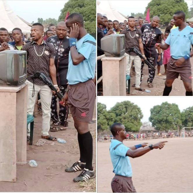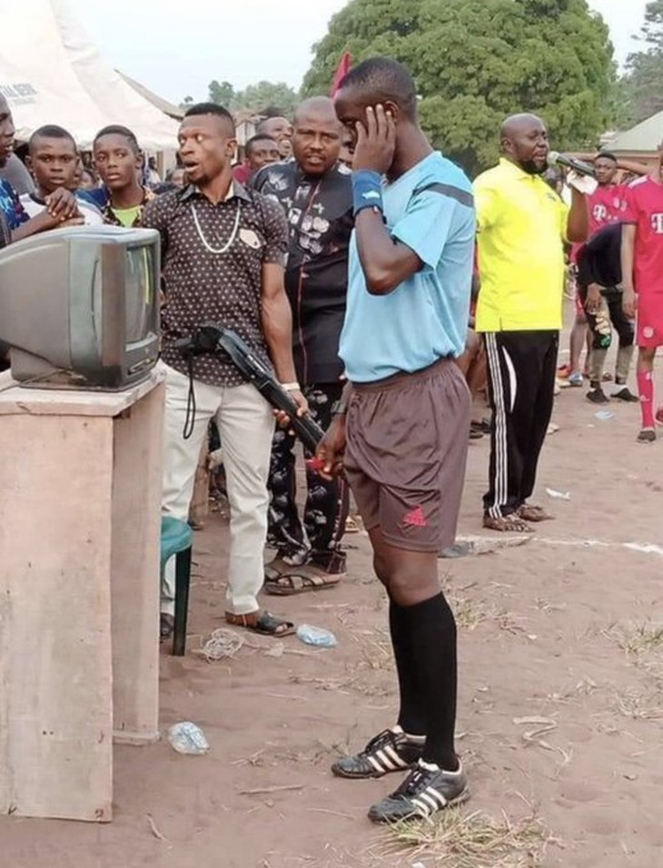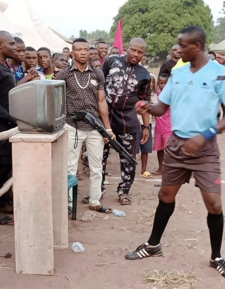 Cảnh trọng tài bắt một trận đấu “phủi” ở châu Phi đang sử dụng VAR khiến người hâm mộ sửng sốt.Thế mới biết, làm trọng tài bóng đá ở giải làng châu Phi thôi cũng có thể coi là nghề nguy hiểm nhất thế giới chứ không giỡn chơi. Cứ nhìn biểu cảm của tay CĐV cầm súng là biết.