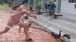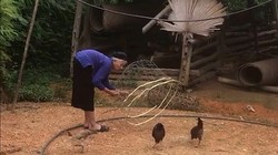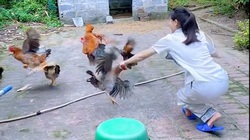 Người đàn ông rải gạo dụ con gà đến gần mình rồi nhanh tay tóm gọn con vật giấu vào áo và tiếp tục dụ con khác.
