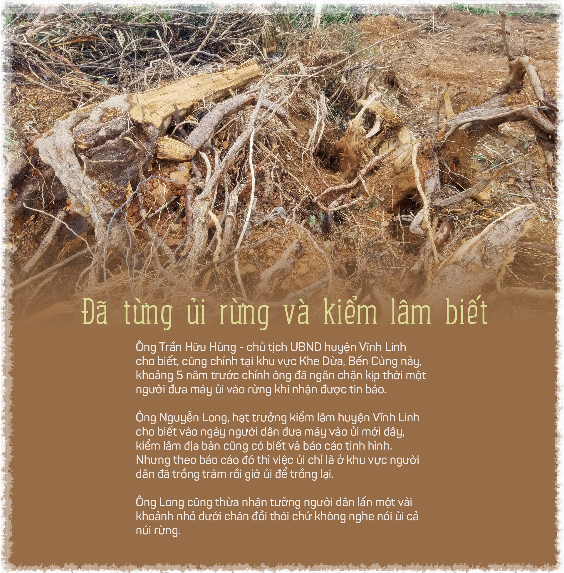 Phóng viên Tuổi Trẻ đã tiếp cận và ghi nhận cận cảnh máy ủi được đưa vào vùng rừng Khe Cau (xã Vĩnh Hà, Vĩnh Linh) ngang nhiên ủi trọc một vùng rừng dày đặc liên tục trong 3 ngày mà không hề bị kiểm lâm hay chính quyền địa phương ngăn chặn.