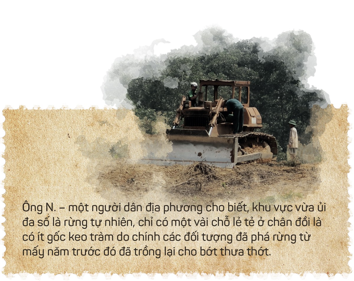 "Nay thì đưa luôn máy vô ủi sạch toàn bộ. Chỉ mới hai tiếng buổi chiều mà cả vạt rừng mấy hecta đã bị cạo sạch" - ông N. nói.