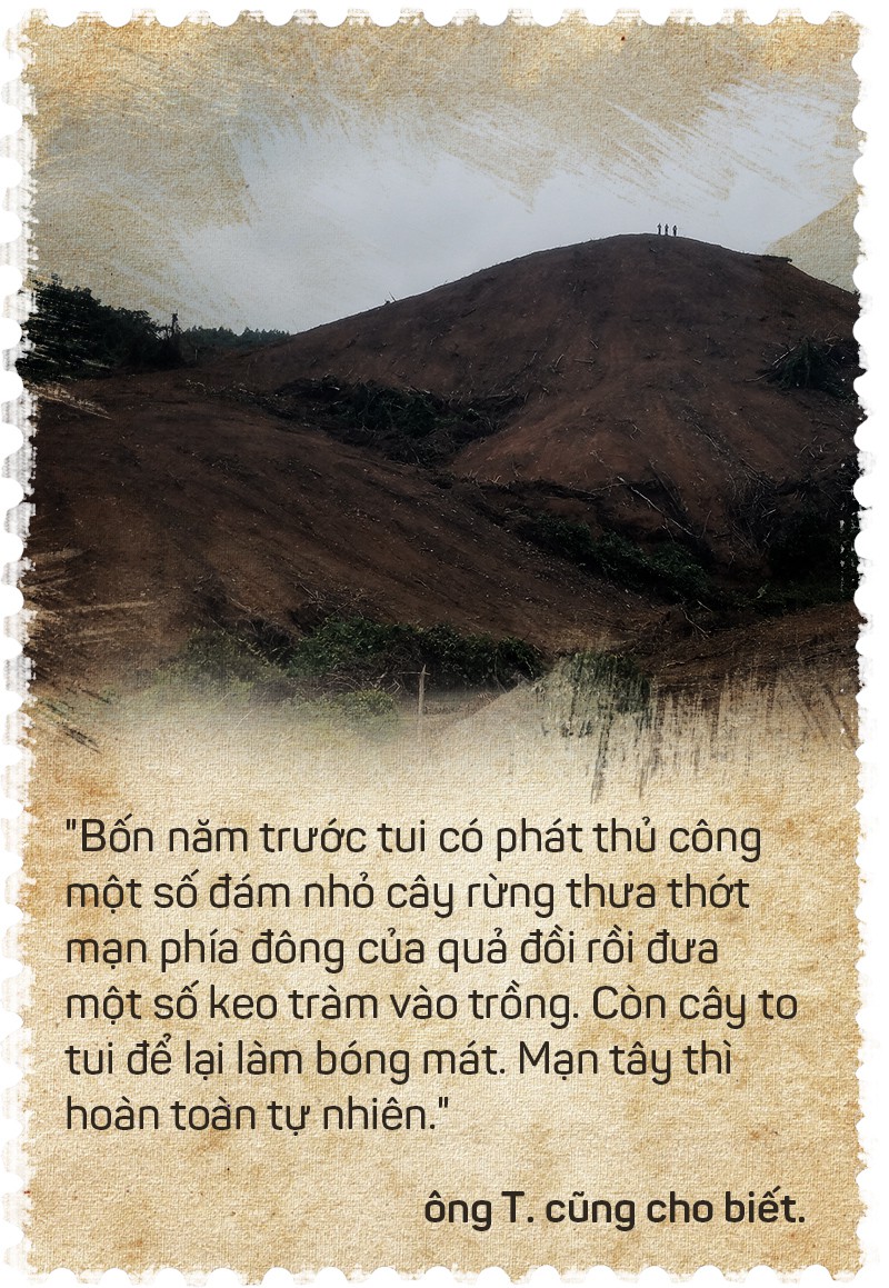 "Bốn năm trước tui có phát thủ công một số đám nhỏ cây rừng thưa thớt ở mạn phía đông của quả đồi rồi đưa một số keo tràm vào trồng. Còn cây tự nhiên to tui để lại hết. Mạn tây thì hoàn toàn tự nhiên", ông T. cũng cho biết thêm.