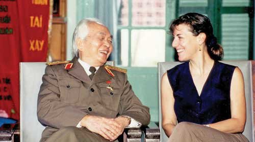TTCT - Năm 1990, nhà sử học, nhà báo Stanley Karnow nổi tiếng thế giới đến Việt Nam. Ông đưa con gái mình, Catherine Karnow, theo cùng. Năm ấy cô 26 tuổi, là một nhà báo ảnh tự do. Catherine và tướng Võ Nguyên Giáp tại nhà riêng năm 1994, sau khi cô chụp ảnh cho ông và gia đình - Ảnh do nhân vật cung cấp Cô gái trẻ chụp ảnh tướng GiápTháng 3-1990, “cha tôi đến Việt Nam để viết một bài về tướng Võ Nguyên Giáp cho tờ New York Times. Dắt tôi theo cùng, ông hứa hẹn đây sẽ là nơi rất thú vị”. Và đúng như lời ông nói, 20 năm qua Catherine nhiều lần trở lại Việt Nam, bấm máy, tiếp tục ghi chép gương mặt mới của đất nước mà cha cô đã đi qua suốt một thời máu lửa chiến tranh Việt Nam.Những lần cha cô trò chuyện với tướng Giáp, Catherine là người chụp ảnh chân dung ông. Khi bài phỏng vấn của Stanley Karnow thành hình trên New York Times cũng là lúc Catherine thật sự trở thành một người bạn gần gũi khác của gia đình vị tướng này. Cô mô tả vị tướng huyền thoại mà cha cô từng viết rất nhiều trong các tác phẩm của ông: “Tướng Giáp giống một người theo chủ nghĩa khắc kỷ, sẵn sàng và chấp nhận nghịch cảnh. Ngay từ lần đầu tiên tới giờ, tôi luôn bị ấn tượng bởi sự thông minh của ông. Ông không bao giờ nói về chiến tranh trong câu chuyện. Chúng tôi nói về gia đình tôi và gia đình ông. Ông thích kể về những đứa cháu của mình, ngôi trường mà chúng đang theo học”.Nhiếp ảnh gia Catherine Karnow, con gái của nhà báo - nhà sử học Stanley Karnow, hiện nay đang làm việc cho National Geographic Traveler Magazine, Smithsonia Magazine. Chuyên về ảnh trên mục Du lịch Việt Nam cho tạp chí National Geographic, Catherine đã đi khắp Việt Nam. Tấm ảnh của Catherine chụp bà mẹ trẻ với những đứa con tươi cười thò đầu ra cửa sổ tàu Thống Nhất, hay vịnh Hạ Long mịt mờ trong sương sớm... là những bức ảnh xuất hiện trên rất nhiều ấn bản du lịch nổi tiếng thế giới như sách Lonely planet về Việt Nam.Cuộc gặp gỡ ngắn đầu tiên năm 1990 của cô gái trẻ Catherine với huyền thoại của lịch sử Việt Nam đã trở thành một kết nối không phai mờ, thôi thúc cô phải trở lại Việt Nam. Cô thích chụp ảnh chân dung của ông, cảnh ông và các cháu chơi đùa. Trong một bức ảnh, cô chụp tướng Giáp với hai đứa cháu đang khoe bức tranh to chúng vừa vẽ. Nụ cười của ông - không còn ám ảnh bởi chiến tranh - hoàn toàn dịu dàng kiểu một ông lão cưng chiều cháu.Chuyến đi đầu tiên cùng người cha năm ấy đối với cô... chưa đủ. Năm 1994, Catherine trở lại Việt Nam. Cô đến thăm nhà, ăn tối với gia đình tướng Giáp và trò chuyện với vợ ông, bà Đặng Bích Hà.Cô mỉm cười nhớ lại: “Mãi tới lúc gặp ông, tôi mới nhớ ra những lời báo giới đồn đại khi ấy. Họ nói tướng Giáp sẽ trở về Điện Biên Phủ vào tháng 5 để kỷ niệm chiến thắng năm 1954”. Như một may mắn, Catherine đến Hà Nội tháng 4. Trong một lần ghé thăm, tướng Giáp nói với cô: “Tôi muốn quay trở về Điện Biên Phủ và muốn cô đi cùng trong hai ngày tới”.Năm đó, cô gái trẻ người Mỹ đã theo chân người tướng già của một thời đại anh hùng về lại nơi đã làm nên huyền thoại về ông. Cô bay cùng ông đến Điện Biên Phủ, theo chân ông đến từng địa điểm lịch sử mà ông muốn đến.Cô nhớ lại: “Tướng Giáp luôn được mọi người nhận ra dễ dàng, dù đó chỉ là chuyến thăm không chính thức của ông đến Điện Biên Phủ. Ông đã gặp nhiều tướng lĩnh và cựu chiến binh. Ông đặt hoa ở nghĩa trang.Từ trực thăng, ông nhìn lại khung cảnh của toàn bộ trận địa ngày xưa.” Cũng trong chuyến trở về, tướng Giáp đã cùng cô đi bộ xuyên qua một đoạn rừng cho đến khi họ thấy một căn lều nhỏ ở Mường Phăng, nơi ông đã cùng đồng đội thảo kế hoạch trận chiến. Đó là lần đầu tiên Catherine đi theo ông lão hiền từ mà mình đã quen thuộc đến nơi tạo nên tượng đài ông trong lịch sử Việt Nam. Cô chụp ảnh tướng Giáp cười dịu dàng khi ông ngoắc tay với đồng đội, ảnh ông rạng ngời hạnh phúc khi nắm tay các đồng bào đến chúc mừng ông.Nếu như nhà báo Stanley Karnow mô tả tướng Giáp là “nhà quân sự dũng cảm, nhà logic tinh tế và nhà tổ chức không mệt mỏi” thì con gái ông đã miêu tả một tướng Giáp uyên bác, yêu gia đình và những khoảnh khắc hòa bình xung quanh mình.Hình ảnh Việt Nam hậu chiếnCó vẻ như số phận đã khiến gia đình cô gái trẻ này gắn bó với Việt Nam. Mẹ của Catherine đến Sài Gòn năm 1953, kết hôn với một quan chức ngoại giao người Mỹ ở đây. Sau khi chồng mất vì ung thư, năm 1959 mẹ cô tái giá với Stanley Karnow, lúc đó là trưởng phân xã tạp chí Time - Life tại Hong Kong nhưng đang sống với từng nhịp đập của cuộc chiến Việt Nam.Cô hồi tưởng về những ngày tháng ấy: “Tôi không nhớ nhiều lắm, nhưng cái cảm giác sợ hãi, lo lắng, sự chờ đợi, sự bùng nổ của cuộc chiến cứ như một c
