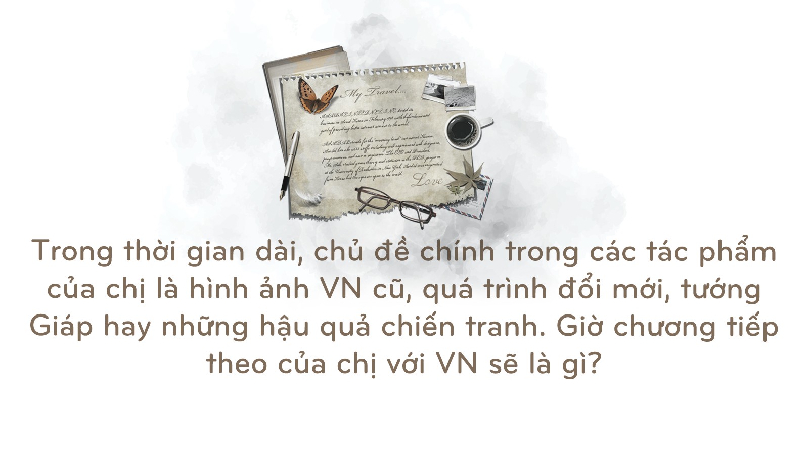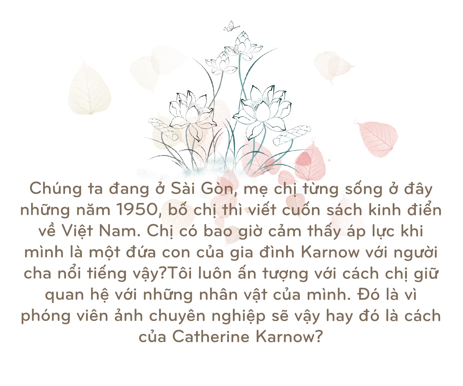 Trải nghiệm sau nhiều năm, tôi thấy chắc chắn có điều gì đó bí ẩn. Tôi không biết nó từ đâu tới và vì sao lại vậy. Đương nhiên nó gắn với thực tế là tôi lớn lên ở châu Á, tôi ở Hong Kong cho tới năm 10 tuổi. Nhưng có phải chỉ là vì tôi được ở cạnh những người châu Á hay không? Không phải vậy. Chỉ là vì khi tôi lớn lên, cha tôi tới VN rất nhiều, tôi không tới VN khi nhỏ. Mọi người hay hỏi tôi về cha (nhà báo Stanley Karnow): "Ông ấy có nói về VN không? Chị có cố gắng thành công được như ông ấy?". Luôn có những câu hỏi kiểu vậy. Nhưng những trải nghiệm của tôi ở VN thì chẳng liên quan gì tới trải nghiệm của cha tôi. Có phải là vì tính cách, con người tôi? Có phải là tôi hợp với VN? Có phải là vì những giá trị mà người Việt tôn trọng thì tôi cũng rất tôn trọng?
