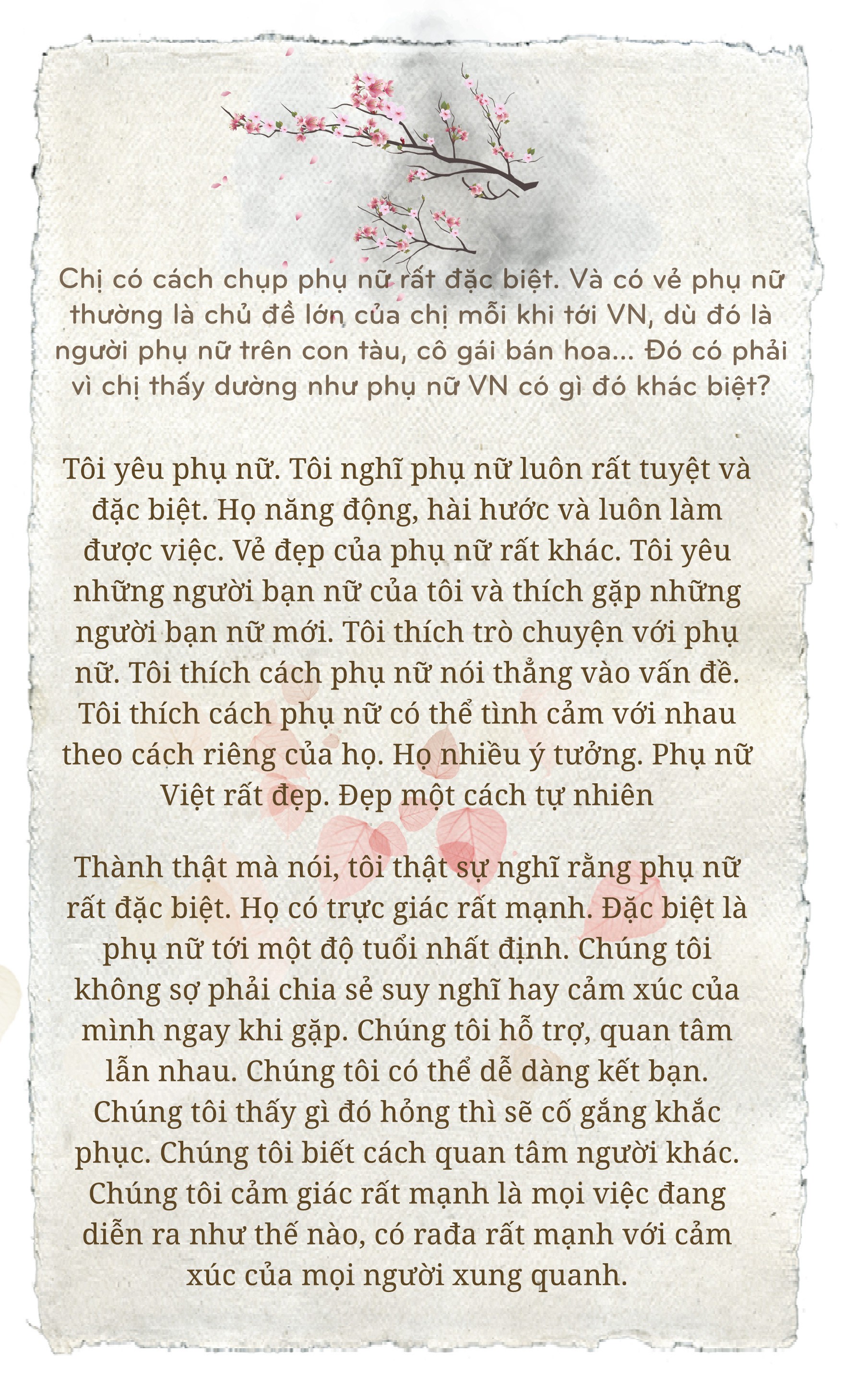 Ở Mỹ hay các nước phương Tây, mọi người luôn tâm niệm là phải hạnh phúc và mọi thứ đều ổn. "Anh sao rồi?". "Tôi rất ổn". Hầu như không ai muốn nói về nỗi buồn. Người phương Tây không biết xử lý nỗi buồn và mất mát thế nào. Trên góc độ là phóng viên ảnh, khi tới VN bắt đầu chụp hình ở đây, đặc biệt là chụp con người, có những biểu lộ mà tôi sẽ chụp đi chụp lại. Dường như mỗi người khi nhìn vào camera hay nhìn tôi, nó giống như một điệu nhạc nổi lên và luôn có một nốt trầm trong đó. Đó là một cái nhìn rất đặc trưng mà bạn thấy ở chân dung của rất nhiều người tôi đã chụp trong nhiều năm qua. Tôi vẫn thấy điều đó trên những khuôn mặt người Việt ở đây - vừa trầm buồn vừa đẹp.