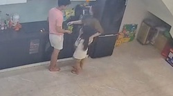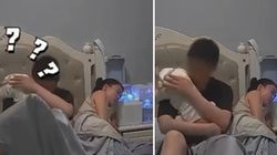 Bé trai đứng lau nhà rồi tự nhận mình là người vất vả nhất, trong khi bố nhẹ nhàng nhất vì chỉ bế em và xem tivi.