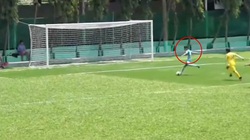 Cầu thủ ôm đầu tiếc nuối rồi nằm gục xuống sân vì không hiểu sao trước mặt là khung thành trống mà vẫn sút không vào.