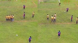 Sau cú ngã, cầu thủ áo trắng xây xẩm mặt mày ngồi nhả bùn trong miệng ra khiến nhiều người xem phì cười.
