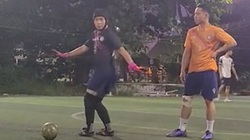Dù trọng tài đã nhắc nhở không nhảy lên trước vạch vôi nhưng thủ môn nghiệp dư vẫn liên tục mắc lỗi khiến nhiều người xem phì cười.