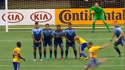 Hoàng Lâm của U11 Khánh Hòa có cú sút phạt từ giữa sân như "nã đại bác" khiến thủ môn đối phương đứng chôn chân và phải vào lưới nhặt bóng.