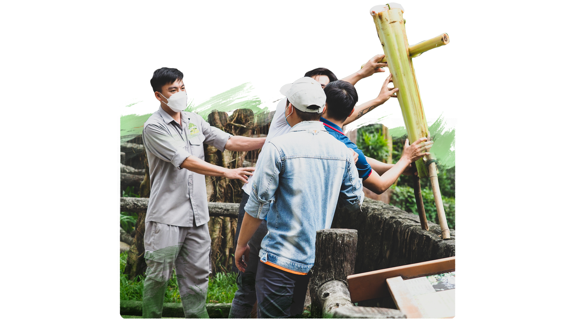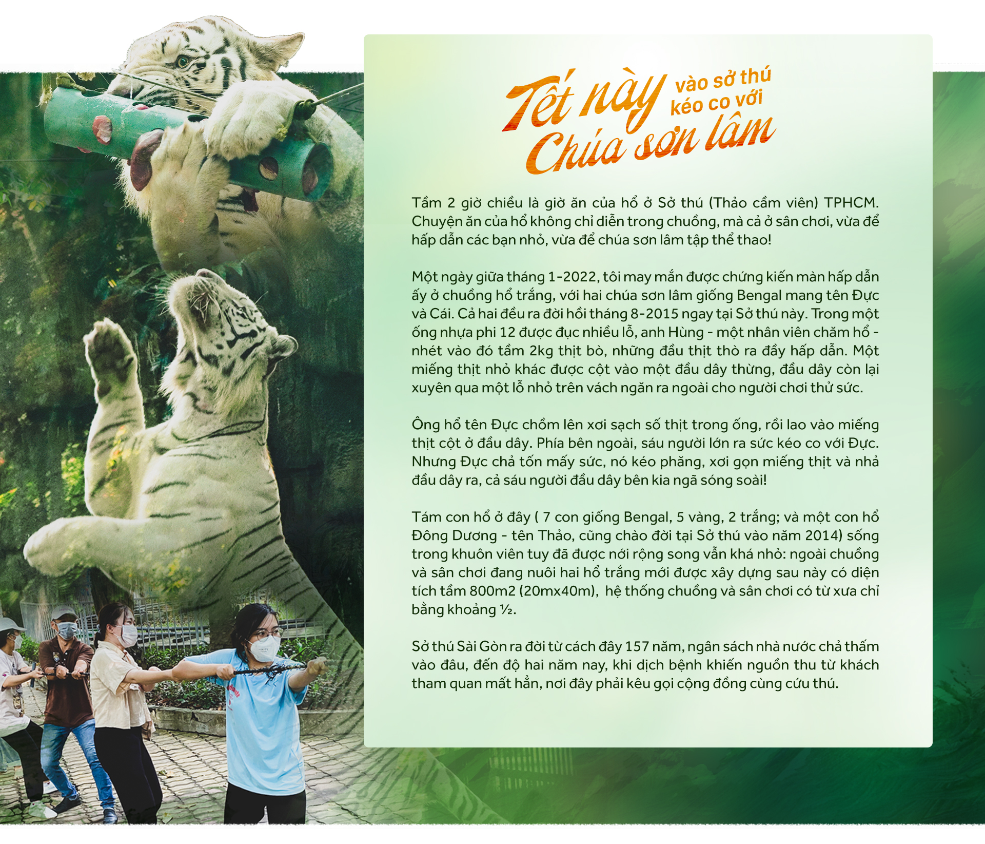 Đó là chuyến thăm đầu tiên vào tận "hậu cung" chuồng hổ, theo chân những người chăm hổ tại Vinpearl Safari Phú Quốc. Ngay sau đó, Trần Duy Phương - tổ trưởng tổ chăm sóc thú dữ - "chiêu đãi" tôi một bữa thưởng lãm màn tập thể thao của hổ: Một hệ thống dây ròng rọc nối từ một cây to được quấn dây thừng (để bảo vệ cây khỏi móng vuốt hổ) trong khu vực an toàn.