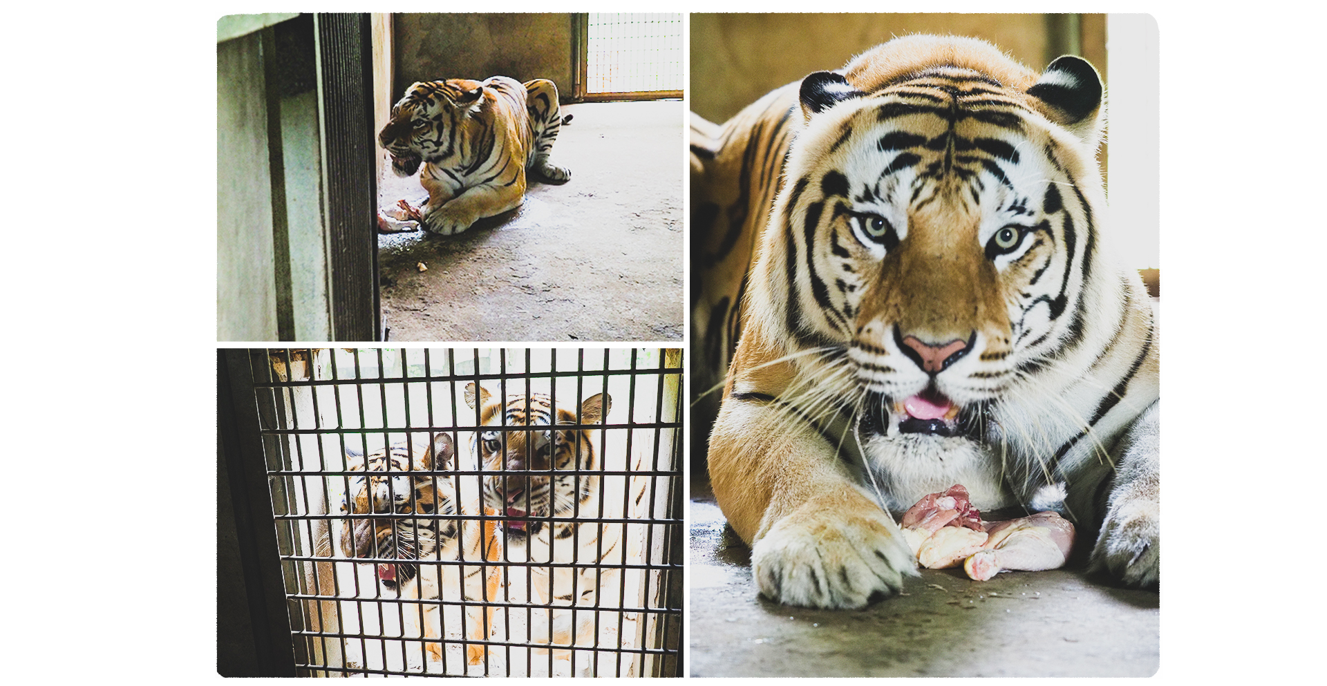 Một tuần sẽ có ba bữa thịt gà, ba bữa xơi bẹ sườn trâu, xương ống heo và nghỉ ăn một ngày. Kèm theo cả vitamine C, dầu cá… được nhét vào trong đùi gà. Bữa ăn của lũ hổ là vào cuối giờ chiều, được các nhân viên chia phần sẵn trong chuồng.