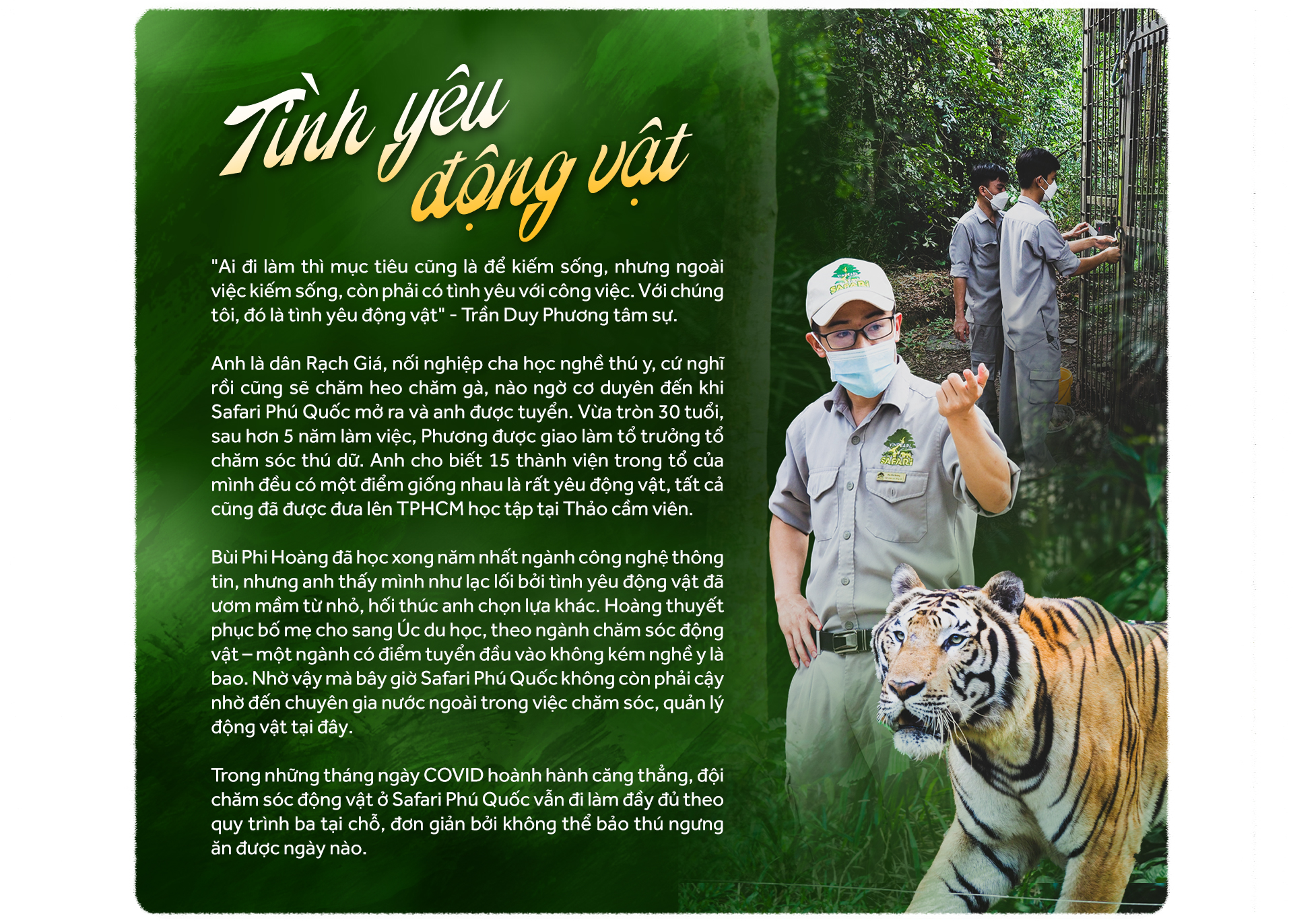 Trần Duy Phương cười trả lời khi tôi hỏi "Khó nhất trong việc chăm hổ ở đây là gì?. Bùi Phi Hoàng - một chàng trai Hà Nội sinh năm 1991, du học Úc về ngành chăm sóc động vật hoang dã, nay là sếp tổng quản chăm các loại thú ở Safari Phú Quốc cũng xác nhận, nuôi hổ rất dễ.