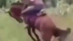 Người bạn cầm điện thoại quay video được phen cười té ghế khi thấy chàng trai cưỡi ngựa bị hất lộn nhào xuống đất.
