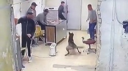 Chàng trai đeo mặt nạ sói đi hù dọa các chú chó đang nằm ngủ khiến chúng bỏ chạy trối chết.