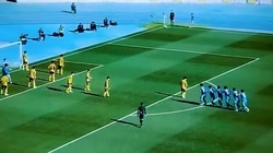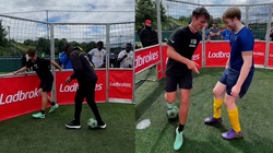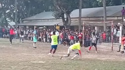 Chàng trai tung cú 'nã đại bác' từ giữa sân khiến thủ môn đối phương không thể cản phá, phải vào lưới nhặt bóng.