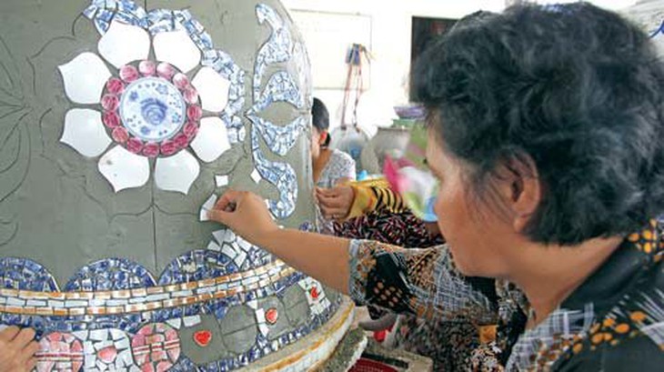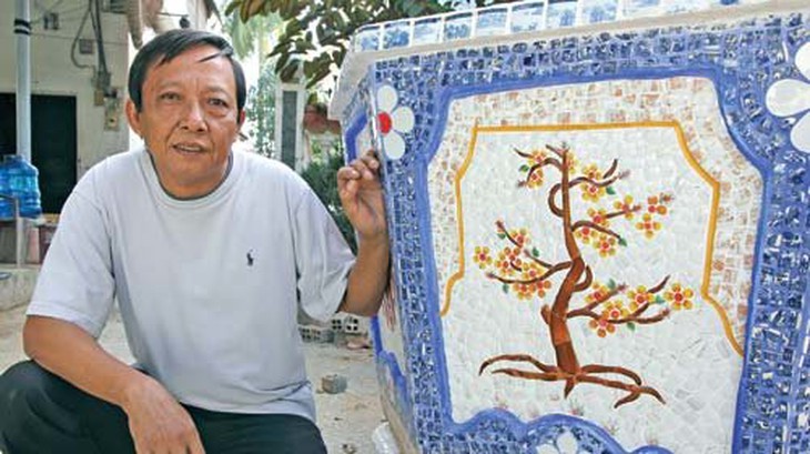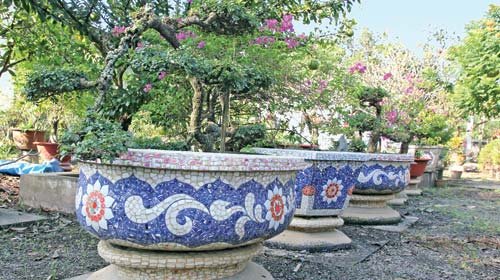TTCT - Từ lâu, cùng với nghề trồng mai, ở làng mai (phường Hiệp Bình Chánh, quận Thủ Đức, TP.HCM) hình thành nghề làm chậu kiểng với hoa văn bằng miểng sành sứ khá độc đáo, riêng biệt. Read this on Tuoitrenews.vn Câu chuyện về nghề làm chậu kiểng làng mai cũng là chuyện gắn với một con người, một gia đình quyết giữ dấu xưa... Phóng to Chậu kiểng hoa văn sành sứ - hình ảnh quen thuộc ở làng mai - Ảnh: Việt Quê Chậu kiểng của ông Năm Miểng Nghệ nhân Năm Miểng tên thật là Trần Ngọc Hường (sinh năm 1911), mất đã hai năm nay, nhưng ở vùng Cầu Quán (nay là đường 51, phường Hiệp Bình Chánh) này nói tới ông hầu như ai cũng biết. Đối với nghệ nhân Út Thao - con trai út được ông tin cẩn truyền nghề, ký ức về cha luôn in đậm. Không phải người con nào trong nhà cũng chịu khó theo đuổi công việc chân tay cực nhọc này nên ông Hường luôn khuyến khích các con, đặc biệt “treo thưởng” cho người nào làm siêng. Hiện trong gian thờ còn để lại một bộ phản có cẩn hoa văn sành sứ khá đẹp (bằng miểng chén kiểu Nhật) được làm từ năm 1964, bên dưới tấm phản còn khắc lại dòng chữ: “Bộ phản này tao cho đứa nào siêng, không cho đứa làm biếng”.Theo lời kể của ông Út Thao, cha ông vốn xuất thân là thợ mộc rồi làm công nhân trong xưởng đóng tàu Ba Son. Việc ông Trần Ngọc Hường đến với nghề làm chậu kiểng sành sứ khá tình cờ. Một lần thấy người ta đổ đống chén dĩa bể ngoài đường, sợ ai giẫm phải, ông quét gom lại, sau đó về nhà lại thao thức. Từng thấy người ta cẩn miểng chén dĩa trên các hình vật nơi đình chùa, ông Hường nghĩ những mảnh vụn sành sứ cũng có thể hữu dụng và trở nên đẹp đẽ nếu được dùng đúng chỗ. Thời ấy người trồng mai ở Thủ Đức thường dùng chậu kiểng mua từ Lái Thiêu (Bình Dương), cũng có người tự đúc chậu dùng, nhưng chưa ai nghĩ đến việc dùng miểng chén dĩa trang trí tạo hoa văn cho chậu kiểng. Nghĩ là làm, ông Hường là người đầu tiên thử làm chậu kiểng cẩn hoa văn sành sứ để sử dụng trong nhà. Không chỉ làm chậu kiểng sành sứ, ông Hường còn “thử nghiệm” kỹ thuật này ở hầu khắp đồ vật trong nhà như: bàn thiên, lư thờ, lăng mộ, bộ phản... Không phải người con nào trong nhà cũng chịu khó theo đuổi công việc chân tay cực nhọc này nên ông Hường luôn khuyến khích các con, đặc biệt “treo thưởng” cho người nào làm siêng. Hiện trong gian thờ còn để lại một bộ phản có cẩn hoa văn sành sứ khá đẹp (bằng miểng chén kiểu Nhật) được làm từ năm 1964, bên dưới tấm phản còn khắc lại dòng chữ: “Bộ phản này tao cho đứa nào siêng, không cho đứa làm biếng”. Từ chỗ làm chậu kiểng để dùng trong nhà, đến khoảng năm 1960 sân vườn ông Hường có một dàn chậu kiểng độc đáo, bắt mắt khiến tên tuổi ông nổi tiếng khắp vùng. Cái tên nghệ nhân Năm Miểng được gọi từ đó. Khoảng năm 1978, dòng chậu kiểng sành sứ làng mai chính thức đi vào thị trường. Phóng to Đúc ximăng - Ảnh: Việt Quê Phóng to Dán miểng sành sứ - Ảnh: Việt Quê Nghệ nhân Út Thao và nỗi trăn trở nghề gia truyền Khi chậu kiểng sành sứ làng mai đi vào thị trường, mọi người biết đến nó nhiều cùng với cái tên nghệ nhân Út Thao. Ông Út Thao (tên thật là Trần Ngọc Thao, hiện làm việc ở Hội Nông dân quận Thủ Đức) là người mà sinh thời ông Năm Miểng đã “chấm” là “đứa làm siêng”. Mọi ngón nghề, bí quyết làm chậu kiểng sành sứ ông Năm Miểng tập trung truyền hết cho Út Thao. Theo ông Út Thao kể việc gia đình theo nghề làm chậu kiểng sành sứ trước hết vì đam mê. Khoảng năm 1980, hằng ngày phải đạp xe lên tuốt Lái Thiêu (Bình Dương) đến các lò gốm sứ để lượm miểng chén dĩa, đi cả ngày mới kiếm được một bao. Ngày nào cũng đi như thế, gom lại rồi về phân loại, chọn hình, lựa sắc... Sau này việc thu gom miểng chén dĩa thuận tiện hơn khi các lò giao hàng tận nơi. Nhưng dù việc tìm kiếm miểng sành sứ có thuận tiện đến đâu thì việc làm chậu cũng khá vất vả. Mọi công đoạn làm chậu đều thực hiện bằng tay, từ việc đúc ximăng đến cắt miểng, dán miểng... Đặc biệt, việc thực hiện hoa văn trên thân chậu phải do bàn tay nghệ nhân phác thảo, bố cục hình và màu sắc rồi mới giao thợ làm. Phóng to Nghệ nhân Út Thao bên một sản phẩm vừa hoàn thành - Ảnh: Việt Quê Do công việc chân tay và đòi hỏi phải tỉ mẩn, nên hiện nay số thợ theo nghề làm chậu kiểng sành sứ này đang thưa thớt dần. Ông Út Thao cho biết hiện ông đang dần giao lại công việc cho con trai út nhưng: “Chắc chắn nó không bằng tui, cũng như ngày xưa tui không bằng cha tui”. Nhưng điều ông Út Thao trăn trở không phải là chuyện “đẳng cấp”, mà là không biết con mình có đủ lòng yêu nghề, sống chết với nghề không. “Cũng từ nơi này, tui đào tạo cho năm người cháu (gọi bằng chú và cậu), hiện nay các cơ sở chậu kiểng sành s
