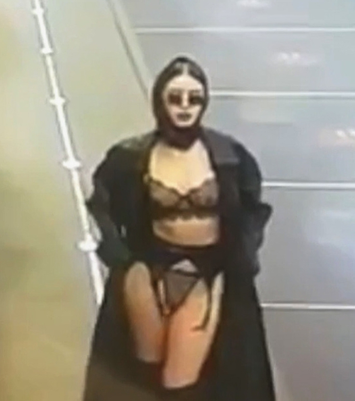 Trước đó, người phụ nữ này mặc áo choàng đen dáng dài, chân đi bốt, trùm kín đầu và đeo kính đen "cực ngầu". Cô thong thả bước những bước đi thần sầu, chẳng thua kém bất kỳ một người mẫu nào, như thể cô đang sải chân trên sàn diễn thời trang.