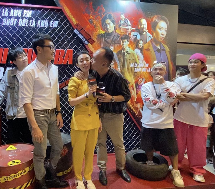 Vợ chồng Thu Trang - Tiến Luật hạnh phúc rạng ngời khi Chị Mười Ba 2 thắng lớnTiếp đến, khán giả yêu cầu Tiến Luật hôn Thu Trang. Chẳng chút ngại ngần, Tiến Luật hôn Thu Trang tới tấp khiến đám đông khán giả la hét ầm ĩ. Cinetour chính thức bùng nổ trong khoảnh khắc Tiến Luật hôn "Chị Mười Ba". Sau màn thả cẩu lương cấp độ mạnh này, Tiến Luật đã nói: "Đáng lẽ trong không khí vui như thế này em phải cho anh thêm tiền".