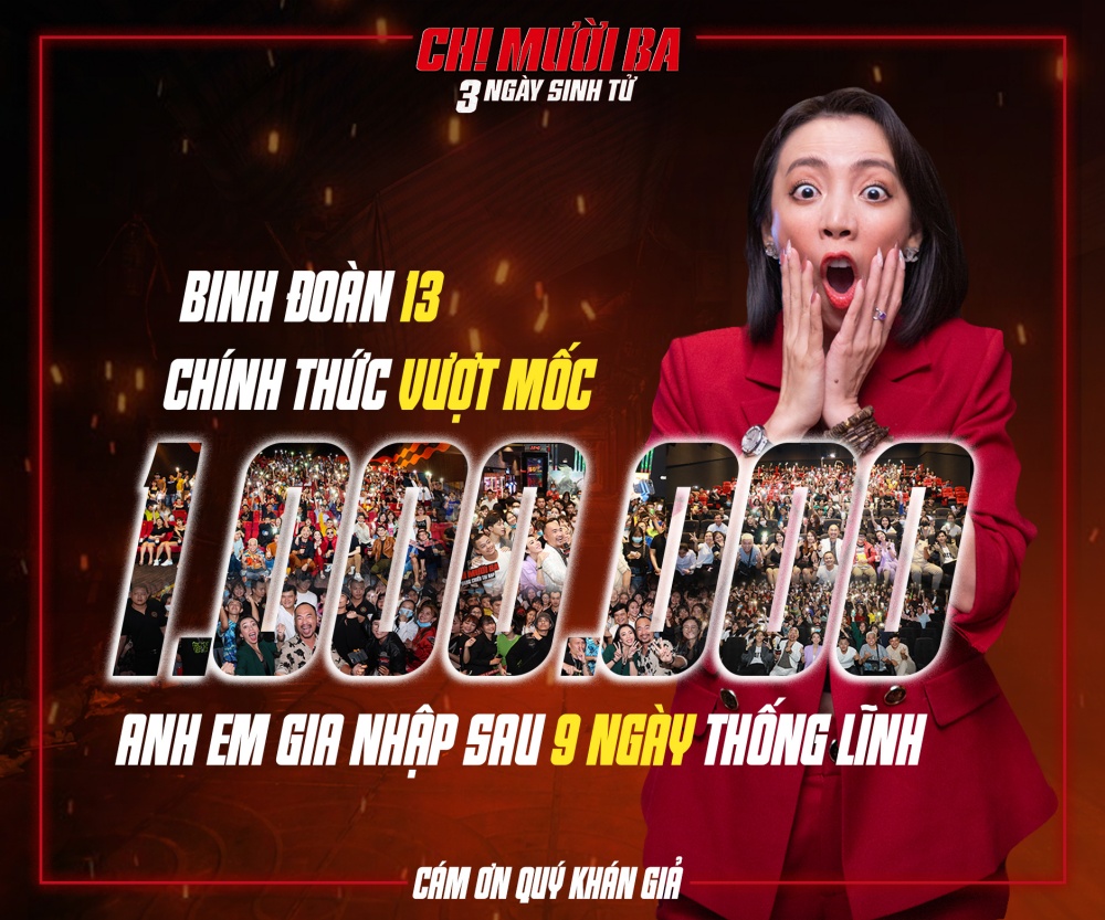 Sau 9 ngày khởi chiếu, phim điện ảnh Chị Mười Ba - 3 ngày sinh tử của Thu Trang - Tiến Luật đã chính thức cán mốc 1 triệu lượt vé bán ra. Chị Mười Ba - 3 ngày sinh tử ra mắt từ 25-12 và liên tục phá đảo các phòng vé trên cả nước.
