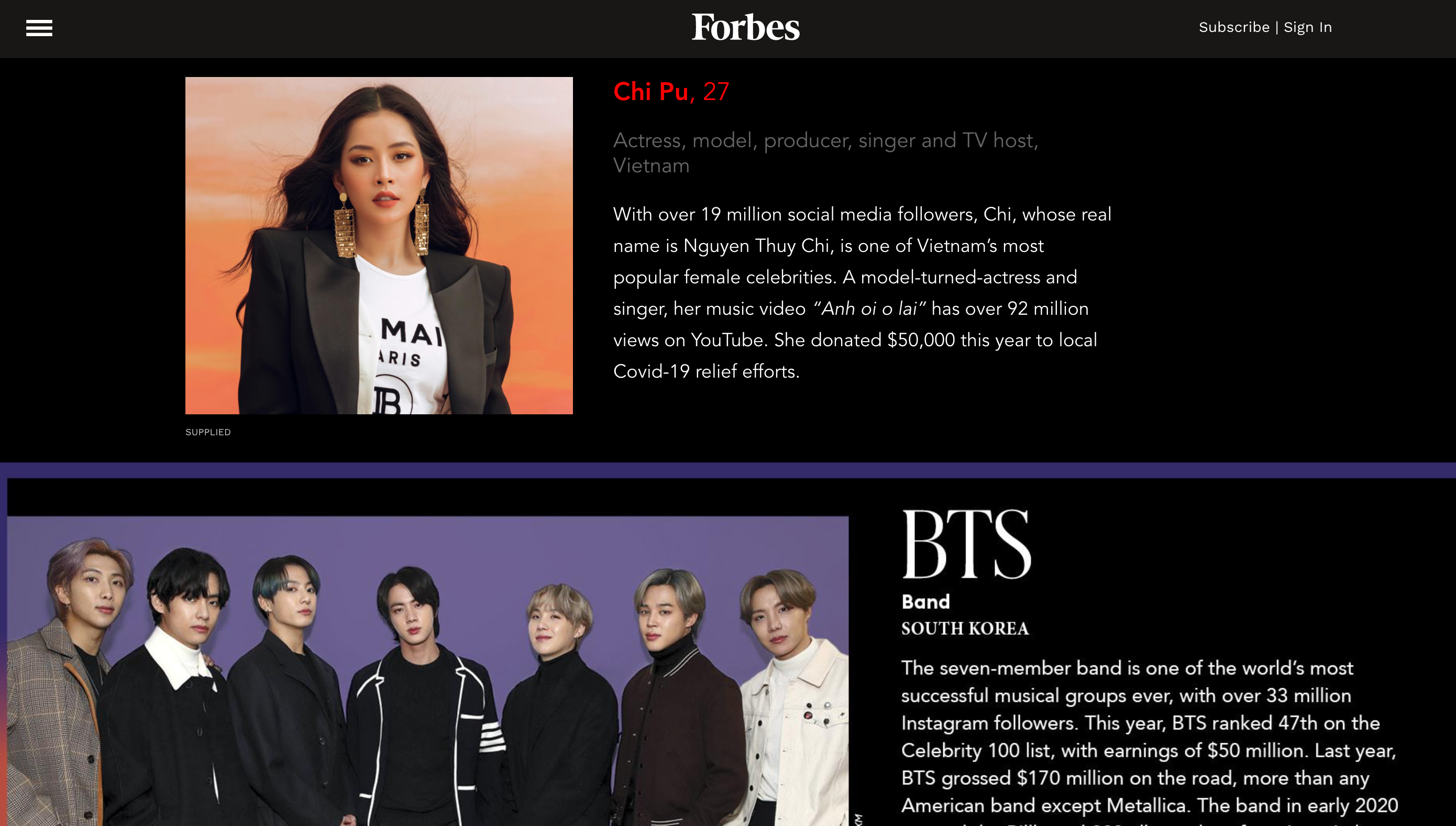 Theo Forbes, nhiều ngôi sao trong danh sách, trong đó có Chi Pu, đã sử dụng sức ảnh hưởng của mình để quyên góp, giúp đỡ những hoàn cảnh khó khăn, đặc biệt là cho công tác phòng chống dịch COVID-19.
