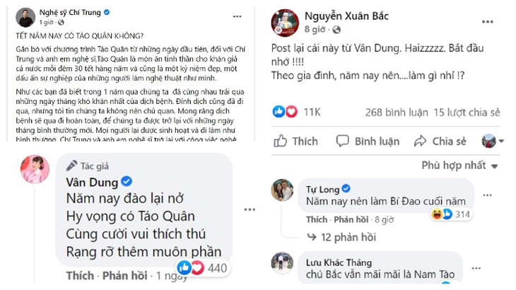 NSƯT Chí Trung gắn bó với các vai Táo trong chương trình Gặp nhau cuối nămTheo đó, trong bài đăng mới đây của mình, NSƯT Chí Trung chính thức xác nhận việc Táo Quân sẽ trở lại theo đúng lịch hẹn. Nam nghệ sĩ viết: "Gắn bó với chương trình Táo Quân từ những ngày đầu tiên, đối với Chí Trung và anh em nghệ sĩ, Táo Quân là món ăn tinh thần cho khán giả cả nước mỗi đêm 30 Tết hằng năm và cũng là một kỷ niệm đẹp, một dấu ấn sự nghiệp của những người làm nghệ thuật như mình.