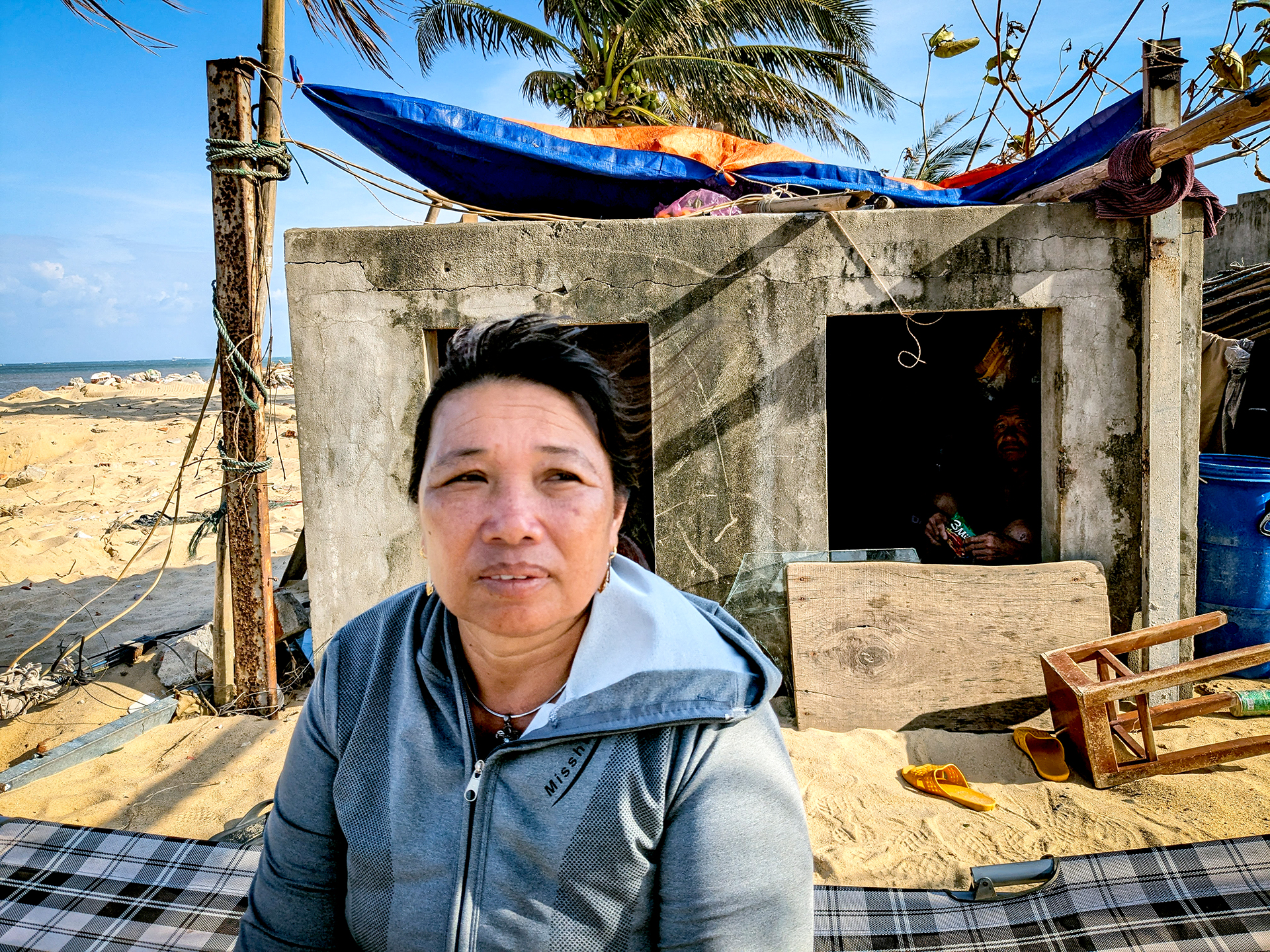 Căn nhà của bà Trần Thị Lẹ (72 tuổi) bị sóng biển đánh sập tại thôn Phú Thứ, xã Phù Mỹ Bắc, Gia Lai - Ảnh: TẤN LỰC